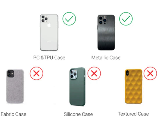 Stix Grip is compatible with all plastic, carbon fiber, PC, TPU cases, but will not adhere to silicone or heavily embossed cases.